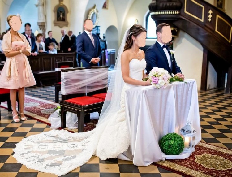 Suknia posiada dekolt w kształcie serca oraz piękny podpinany tren. Tren jest bardzo lekki (koronkowy), także nie sprawia przytłacza sukni po jego upięciu,