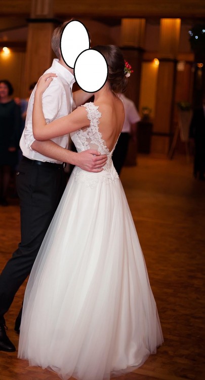 Suknia jest delikatna i subtelna z przodu, zachwycającą wszystkich koronkowym i odważnym tyłem.