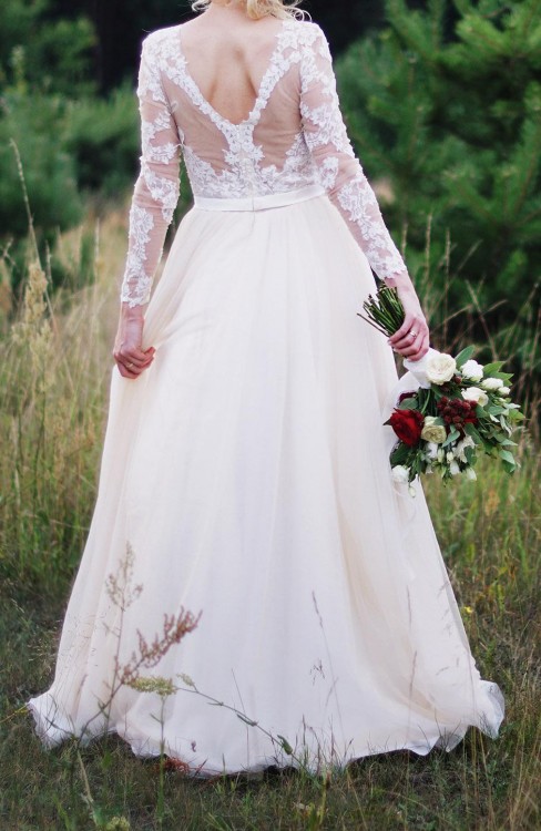 Suknia ślubna z salonu AMY LOVE to połączenie sukni Nela i Lauri. Suknia w kolorze śmietankowym z warstwą w kolorze nude.