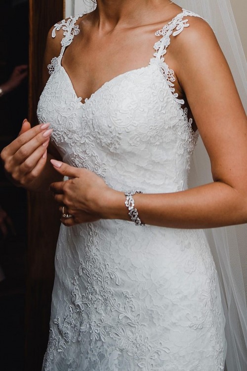 Sprzedam wyjątkową suknię ślubną z salonu Amy Love, rozmiar 36 w kolorze ivory. Idealna na wzrost 165 cm + 9 cm szpilka. Model sukni został delikatnie przerobiony, cała w koronkach, tren podpinany na 1 guzik.