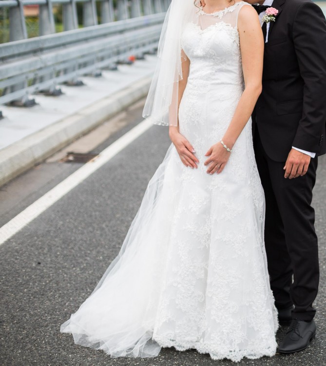 Sukienka wykonana jest z koronki, zarówno dekolt jak i plecy sukienki pokryte są kryształkami. Sukienka posiada dwa treny, co jest z pewnością dodatkowym atutem. Pierwszy tren jest podpinany na jeden guziczek, drugi można w dowolnej chwili odpiąć. Ma wszyte miseczki, dzięki czemu nie trzeba myśleć o zakupie dodatkowej bielizny.