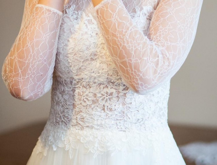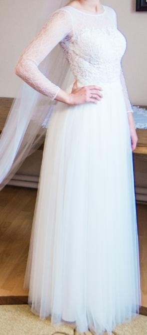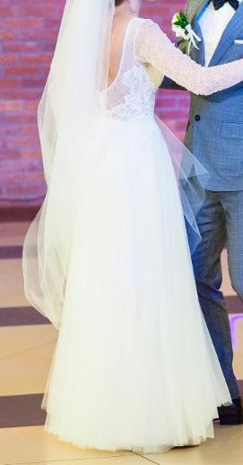 Suknia charakteryzuje się przepiękną, delikatną koronką w części górnej, dużym dekoltem na plecach i długimi rękawami. Dół sukni jest z tiulu, który dopiero przy ruchach nabiera objętości. Suknia jest prosta,modna i ponadczasowa.
