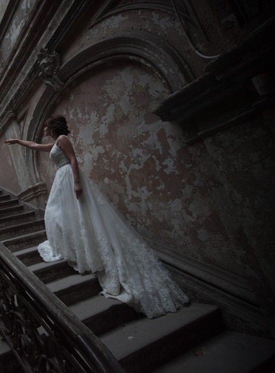 Suknia podkreśla talię, posiada ładnie wykrojony dekolt jak również podpinany koronkowy tren.