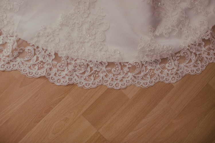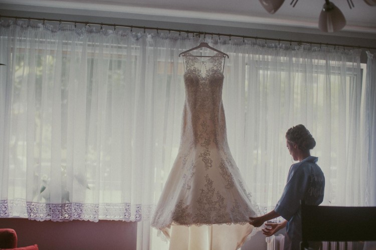 Suknia, po sesji ślubnej wyczyszczona w salonie, w którym była szyta.