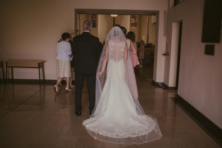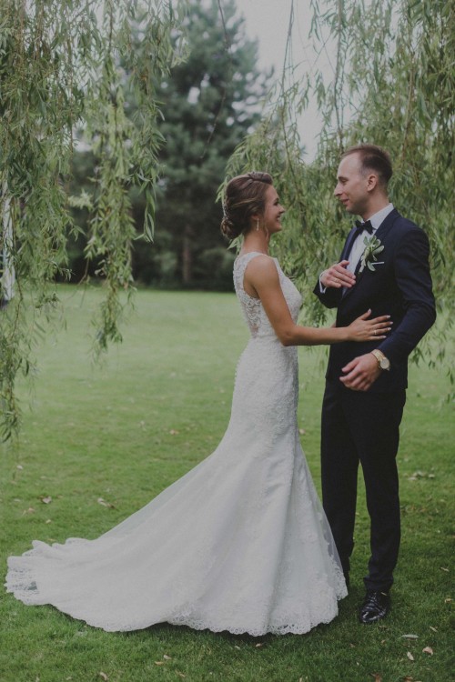 Suknia została zamówiona w salonie w Szczecinie i jestem jej pierwszą właścicielką. Ma fason delikatnej rybki. Jest bogato zdobioną koronką, co nadaje jej elegancji. Kolejnym atutem tej sukni są pięknie wyeksponowane plecy obszyte dodatkowo koronką oraz długi ok 2 m, ciągnący się tren, który można bez problemu podpiąć. Dodatkowo w dole sukni została wszyta fiszbina (możliwość regulacji lub całkowitego wyjęcia), która powoduje, że suknia nie krępuje ruchów oraz delikatnie unosi ją do góry, przez co unika się efektu ciężkiej, prostej sukni. W cenie sukni oferuję długi welon ok. 2,5 m, wykonany z miękkiego włoskiego tiulu.