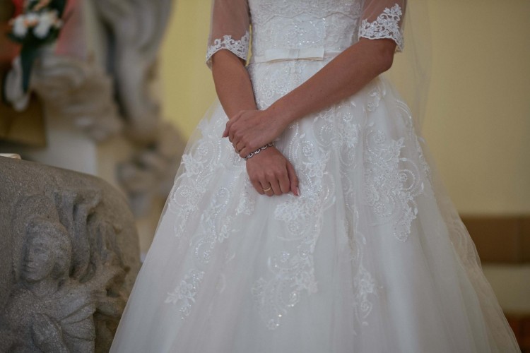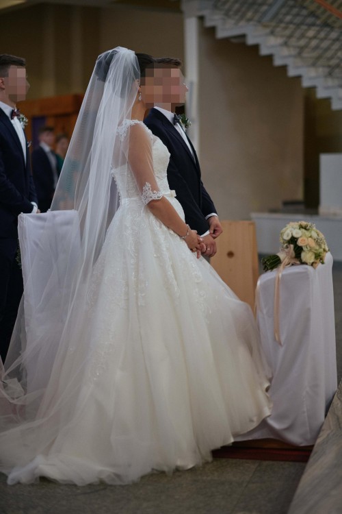 Sprzedam piękną suknię ślubną firmy Annais Bridal, model Jenny, w kolorze ivory. Suknia została uszyta w rozmiarze 38 na wzrost 176 cm, obcas płaski. Gorset zapinany na zamek zakryty dekoracyjnymi guziczkami. Całość gorsetu pokryta jest błyszczącą koronką, która opada na spódnicę sukni. W pasie dziewczęca tasiemka z kokardką podkreślająca talię. Suknia posiada piękny, wielowarstwowy tren, podpinany. W spódnicę zostało wszyte koło.