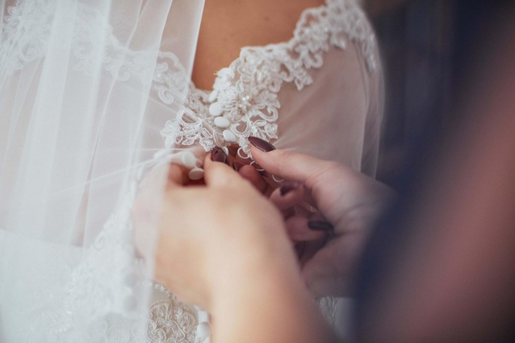 W cenie sukni jest bolerko zapinane na guziczki, z dekoltem w kształcie łódki i koronką.