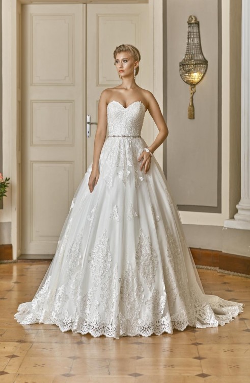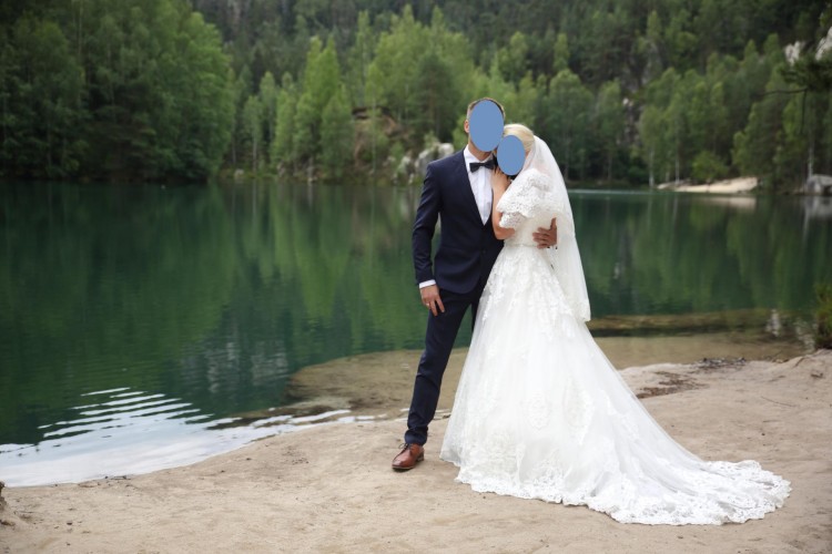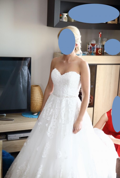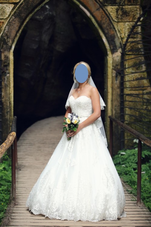 Mam do sprzedania przepiękną suknię ślubną model Finola koloru ecru, koronkowa, gorsetowa z delikatnym zdobieniem w pasie. Kupiona w salonie we Wrocławiu, można dokupić lub wypożyczyć do niej bolerko koronkowe. Rozmiar 38, na wzrost 169cm +4-5cm obcas. Bez welonu. Z tyłu wiązana. Suknia posiada delikatny podpinany tren koronkowy, materiał został wycięty przez co tren jest delikatny i po podpięciu nie tworzy się tzw. "Kaczy kuper". Posiadam również do sprzedania dodatki w kolorze granatowym (buty rozmiar 40 i torebka).