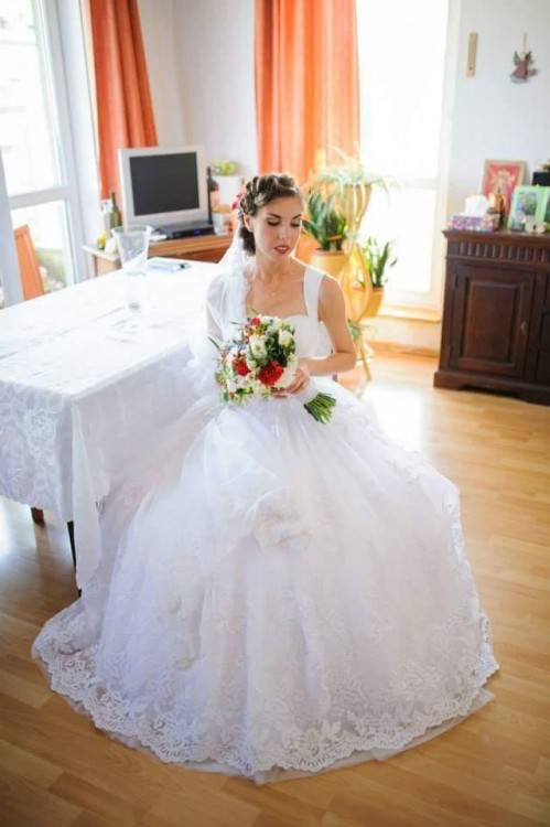 Przepiękna suknia ślubna, ktora przetrwa nawet najbardziej roztańczoną noc. Łatwa do dopasowania do sylwetki dzieki wiązaniu na plecach, a także bardzo solidna dzieki wykończeniu koronką, a nie tiulem. Do zestawu mam halkę i długi welon z koronką pasujący do sukni. Suknia jest w stanie idealnym. Bez żadnego uszczerbku po moim weselu. Uprana czeka na kogoś kto znów przetańczy w niej całą noc.