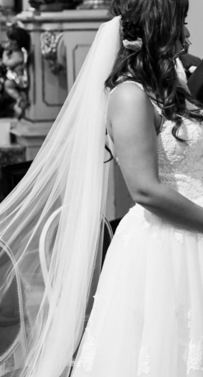 Suknia w rozmiarze 42, na wzrost 175 + obcas ok 7 cm, możliwość zwężenia i skrócenia. Do sukni dokładam welon długi 2,70 m :-)