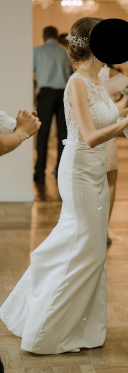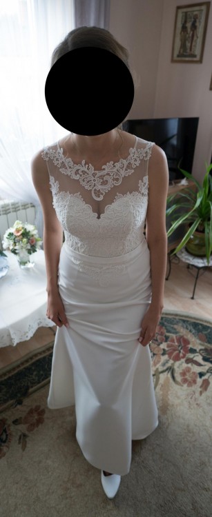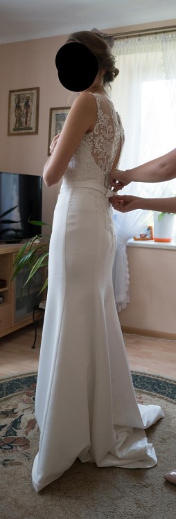 Kolor: ecru. Suknia kupiona w rozmiarze 38- przeróbki polegały jedynie na dopasowaniu długości. Mój wzrost to 180cm, więc spokojnie niższe osoby mogą dostosować suknię do wysokich butów.