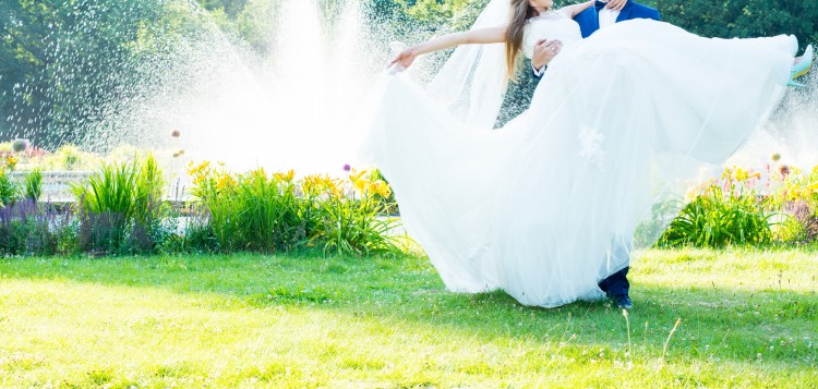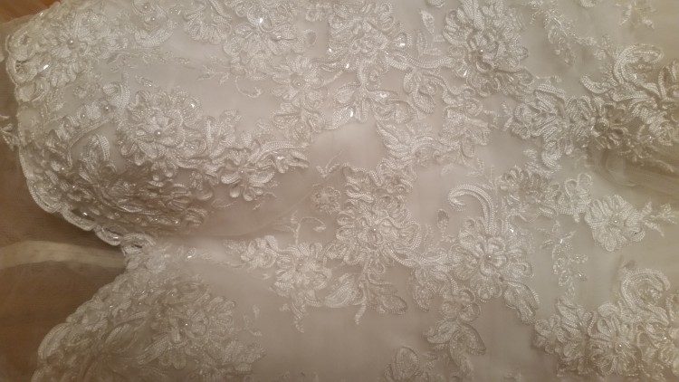 Suknia jest w kolorze delikatny ecru z mieniącymi się perełkami w koronce.