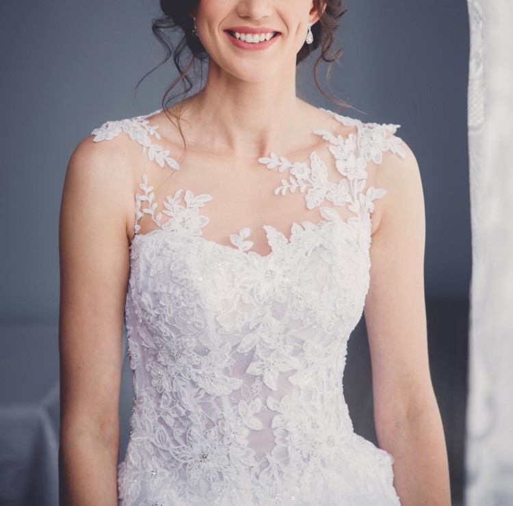 Góra sukni jest asymetrycznie wykończona śliczną, delikatną i pięknie zaakcentowaną koralikami koronką naszytą na cielistą siateczkę, co daje najmodniejszy w ostatnim czasie efekt tatuażu na skórze. Suknia posiada wszyte miseczki i lekkie usztywnienie w talii. Tył sukni zapinany na przezroczyste guziczki.