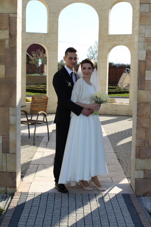 Mam do zaoferowania asymetryczną suknię ślubną. Suknia szyta na wymiar. Projekt własny. Rozmiar 36-36. Szyta na wzrost 164 cm + 9 cm obcas. Wygodna, nie krępująca ruchów, z kontrafałdami suknia ślubna. Do sukni można ubrać halkę uszytą z samego tiulu, aby zwiększyć objętość (nie posiada koła). Bez halki wygląda również bardzo ładnie. Suknia wyprana w pralni chemicznej - ubrana tylko w dzień ślubu, sesji zdjęciowe nie było. Nie posiada żadnych zniszczeń. Suknia będzie również odpowiednia na ślub cywilny. Po wszelkie dodatkowe informacje (w tym dodatkowe zdjęcia, filmik) zapraszam zainteresowane osoby na priv.