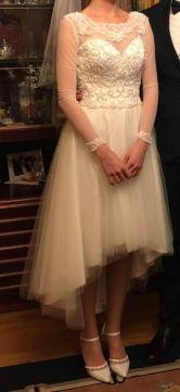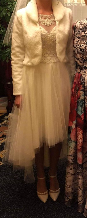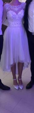 Mam do sprzedania suknię ślubną asymetryczna. Przód krótszy,tyl dłuższy. Kolor kremowy. Posiada dużo dodatków w postaci perelek