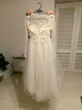 Sprzedam suknię ślubną. Suknia kupiona 23.10.2018r z salonu Mavi. model sukni Liguria, kolor krem. Rozmiar ok 36(34-36) Suknia asymetryczna-przód krótszy, tył dluzszy. Ma 4warstwy tiulu,ktore pięknie się układają. Pod tiulem oczywiście halka. Mnóstwo dodatków w postaci perełek itp. Z tyłu zapinana na guziki. Stanik usztywniany. Sama w sobie robi ogromne wrażenie. Mam też odpowiedni do tej sukni welon tiulowy-zwykly delikatny,zeby nie przyćmić sukni :)