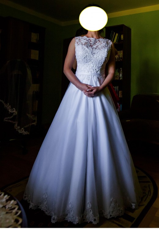 Suknia jest wyprana. Posiada zabudowany koronką dekolt i plecy. Suknia posiada warstwę satyny.W komplecie również halka z kołem.