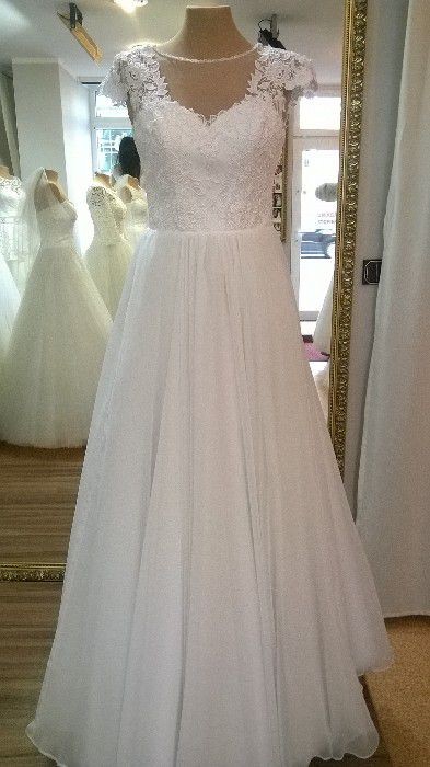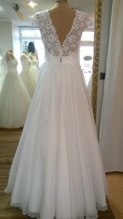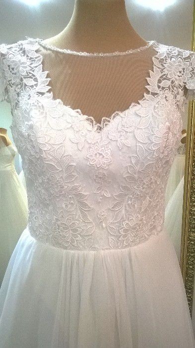 Do sprzedania lekka, zwiewna suknia w kolorze białym, rozmiar 38/40, na wzrost 170 cm + 7,5 cm obcas. Sukienka w kształcie litery A, wykończenie góry z koronki, na plecach bardzo atrakcyjny dekolt w kształcie litery V. Zapinana na plecach na suwak oraz ozdobne guziczki. Do sukienki halka i koło w komplecie gratis. Bardzo ładnie kształtują suknię. Sukienka po weselu została wyprana w pralni.
