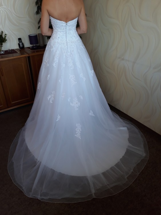 mam do sprzedania suknię ślubną białą marki Sincerity model 3928 rozmiar 38 (na metce USA 8) w kształcie lekkiej princeski.