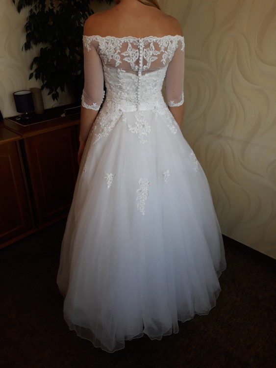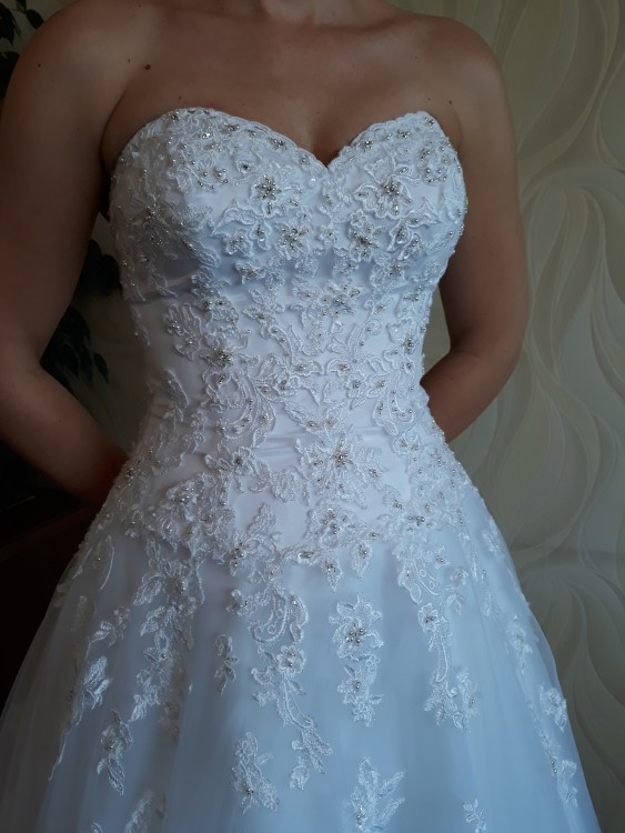 Suknia szyta w Stanach na wzrost 173 + 7cm obcas, z licznymi koronkami znajdującymi się na tiulu sukni, oraz lekko świecącymi koralikami. Gorset bogato zdobiony od środka obszyty sylikonową tasiemką dzięki czemu się nie zsuwa. Zapinana na zamek, który dekorują liczne guziki. Bardzo lekka, zwiewna i wygodna w tańcu.