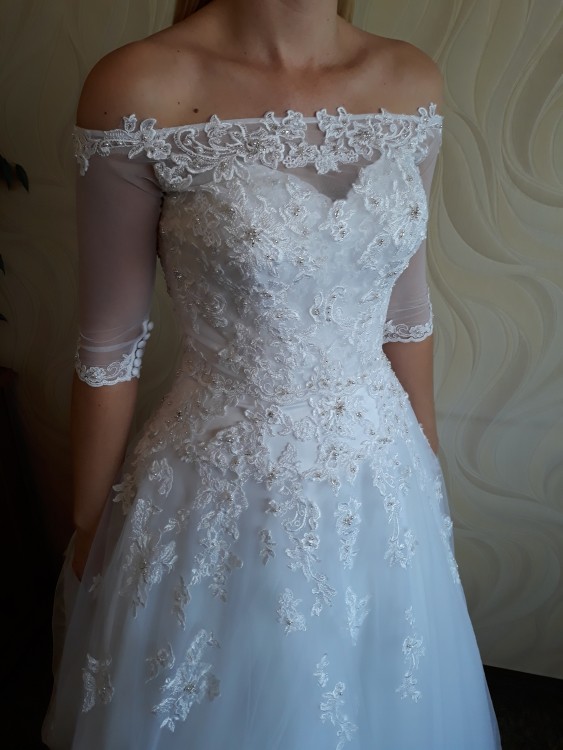 W komplecie z suknią hiszpańskie bolerko zapinane również na guziki oraz welon wykończony delikatnymi koralikami. Suknia posiada tren, który jest efektowny szczególnie w kościele i łatwy do podpięcia ( 3 guziki). Suknia została zakupiona w salonie w Katowicach za 4100 zł, kolekcja 2017.