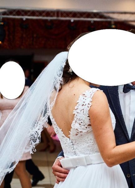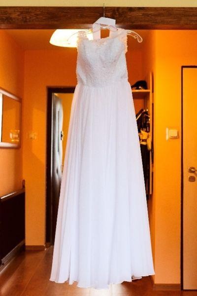 Suknia w kolorze śnieżnobiałym. Dół sukni wykonany z lekkiego, zwiewnego muślinu, góra wykończona gipiurą z tyłu suwak maskowany guzikami.