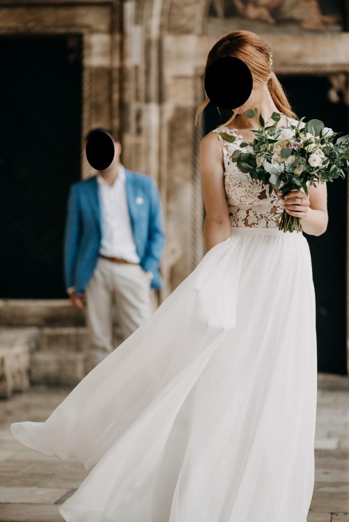 W komplecie z suknią muślinowa spódnica, dzięki której suknia zyskuje lżejszy charakter.