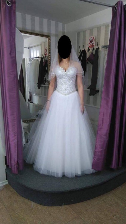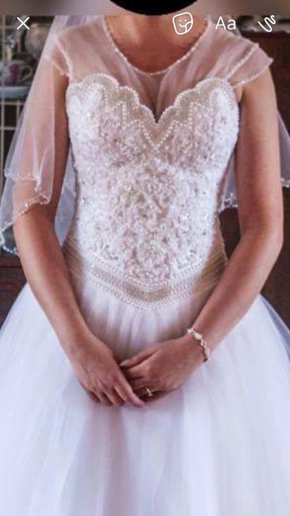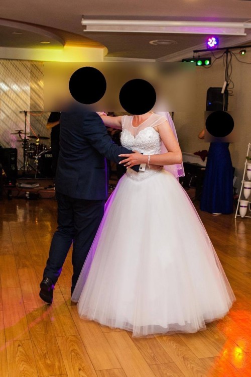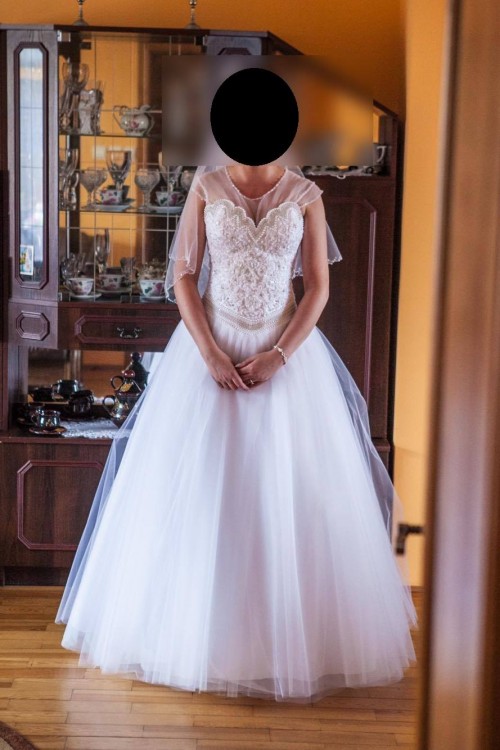 Sprzedam suknię ślubną. Suknia została zakupiona w w Starogardzie Gdańskim. Jest to połączenie dwóch modeli sukni, góra czyli gorset jest od modelu Bicici (Kolekcja Diamond 2017) oraz dół zainspirowany modelem Bianka ( tiulowy dół w kształcie litery A). Gorset typowo od sukienki typu "Princessa". Jednak nie byłam przekonana do typowej Princesski i poprosiłam o uszycie sukienki z dołem w stylu literki A. Zabieg ten okazał się strzałem w 10! Ten gorset i ten dół doskonale do siebie pasują. Przez ten " zabieg" gorset sprawia że gorset pięknie podkreśla oraz wydłuża talię Panny Młodej. Sukienka wiązana jest z tyłu za pomocą sznurka przykrytego wstążką, co daje możliwość idealnego dopasowania do figury. Dzięki temu rozwiązaniu suknia nie zsuwa się. Awaryjnie prosiłam o doszycie ramiączek, ale nie używałam ich. Suknia jest naprawdę wygodna, dobrze leży. Dopasowana jest do wzrostu 165 + 10 cm obcas. Gorset jest pięknie zdobiony koronką i wysadzany cekinami oraz perełkami. Niesamowite wrażenie robi wykończenie nietypowego dekoltu w kształcie muszli. Posiada piękny cekinowy pasek, wyprofilowany w sposób podkreślający talię i wyszczuplający. Sukienka również posiada piękną tiulową koszulkę wykończoną delikatnymi cekinami, którą można założyć lub też nie :) Osobiście koszulkę ubraną miałam w trakcie ślubu.Dół sukni zrobiony jest z kilku warstw tiulu, a jego szerokość można zmieniać za pomocą odpowiednio dobranego koła.