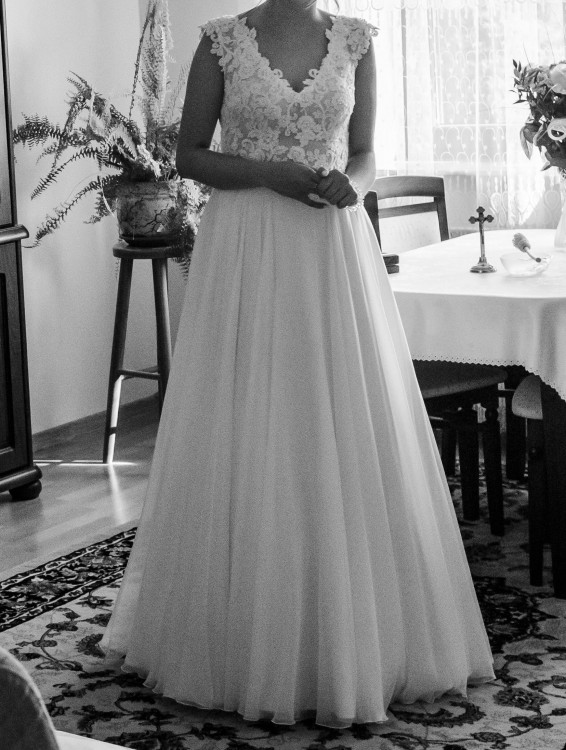 Mam do sprzedania suknię ślubną, zakupioną we wrześniu w salonie sukien ślubnych Adria pod Warszawą. Kolor sukni to biel. Rozmiar 36/38. U dołu wszyte jest delikatne koło/usztywnienie, co okazało się być bardzo wygodnym rozwiązaniem szczególnie w tańcu. Góra wykonana jest z bardzo wygodnej koronki, która nie podrażnia ciała. Suknia posiada delikatne ślady użytkowania. W zestawie długi welon zdobiony na dole koronką.