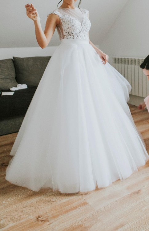 Bardzo oryginalny, idealnie wpisujący się w aktualne trendy model w rozmiarze 36 na wzrost 159 + obcas 9,5 cm (dół można skrócić). – Ja miałam dodatkowo halkę na kole wiec jeśli zdecydowałabyś się na mniejsze koło lub całkowicie byś z niego zrezygnowała suknie mogłabyś obciąć i to sporo. (suknia wygląda z kołem jak i bez przepięknie)