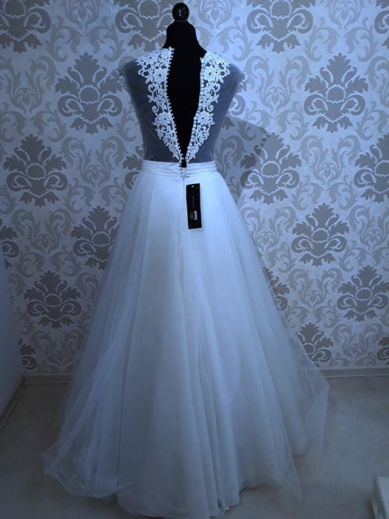 W suknię wszyte są cieliste miseczki, a więc problem poszukiwania odpowiedniej bielizny masz z głowy. Oczywiście miseczki można odpruć bez szkody dla sukni i wszyć pasujące na Ciebie rozmiarem.