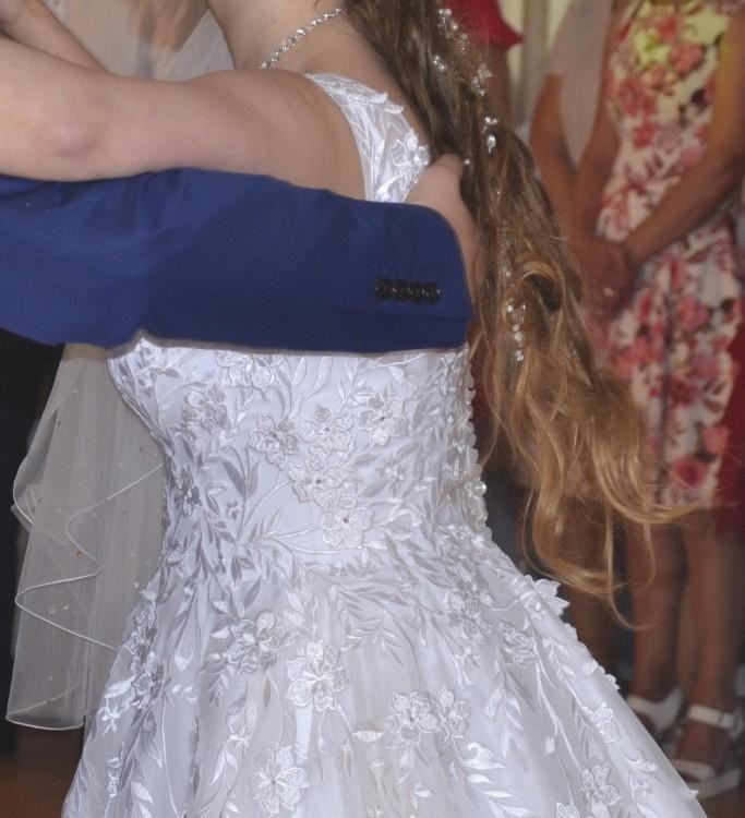 Suknia ma na sobie drobinki, które pięknie błyszczą podczas tańczenia oraz na sesji.