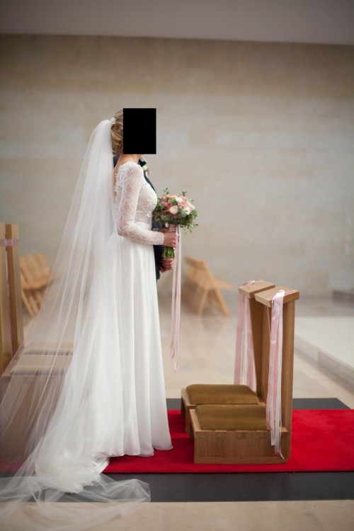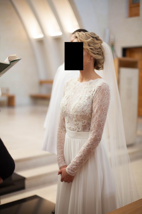 Podsumowując suknia jest nowoczesna i elegancka. Dzięki swojej delikatności i skromności pasuje również do stylu boho. Na sesji plenerowej miałam loki oraz wianek i równie pięknie się całość komponowała :)