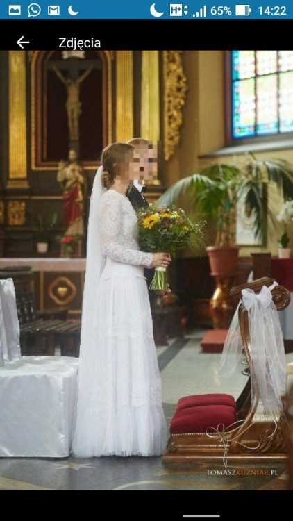 Sprzedam suknię ślubną szytą na miarę, rozmiar S (36). Stan idealny, wykonana z pięknej koronki oraz tiulu w kropeczki. Wykończona małymi perełkami. Odkryte plecy, z tyłu guziczki. Wszyte miseczki. Dodaję długi tiulowy welon gratis :)