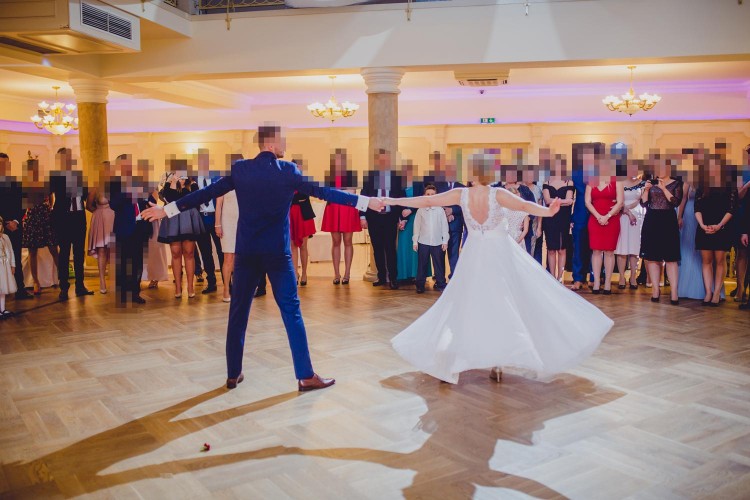 Tył sukni oraz pasek są zapinane i ozdobione perełkami.