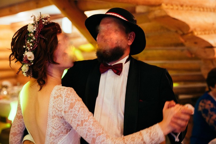 Suknia z leciutkimi, nielicznymi (widocznymi jedynie po przyglądnięciu się w ręku) zaciągami - była w kilku miejscach podszyta nitką gdyż na zabawie weselnej okazała się być za długa do niskich butów ;)