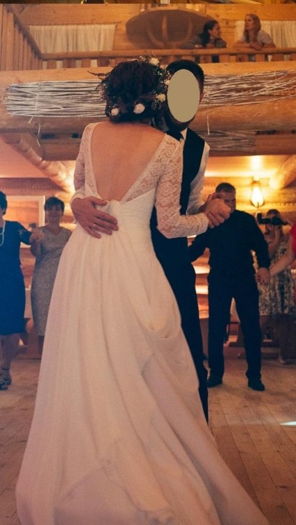 Suknia ślubna w kształcie litery A wykonana z koronnki i szyfonu. Rozmiar 36/38. Szyta na wzrost 172 plus obcas 7 cm. Oczywiście mozna ja skrocic. Przód zabudowany koronką, długi koronkowy rękaw. Plecy wycięte w głęboką literę V. Bardzo oryginalny, stylowy model sukni ślubnej, z tyłu efektowny tren. Do sukni dołączam koło - świetnie się spisuje w czasie zabawy, suknia nie pląta się między nogami ;)