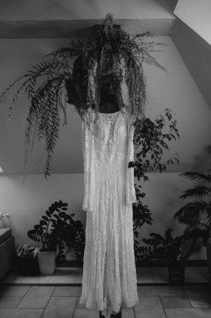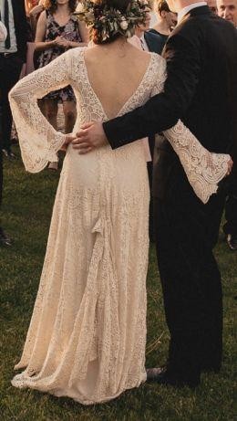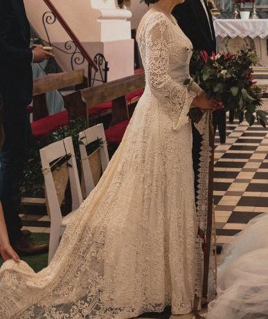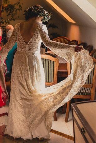 Sprzedam suknię ślubną z gipiury w kolorze ecru. Szyta na miarę przez krawcową na osobę 174 i do płaskich butów.
