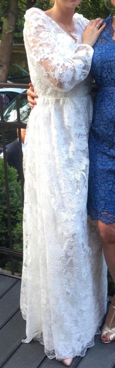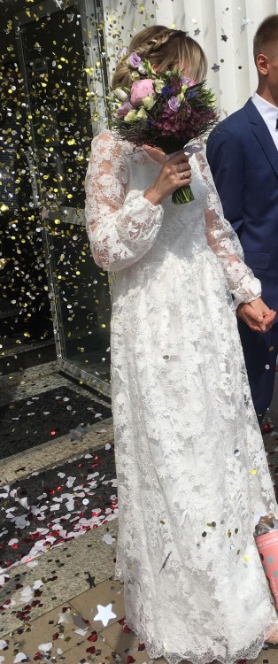 Szyta na 174 + obcas 9 cm, ale myślę, że dobra krawcowa bez problemu skróci suknię, nie tracąc przy tym jej pięknego wykończenia.