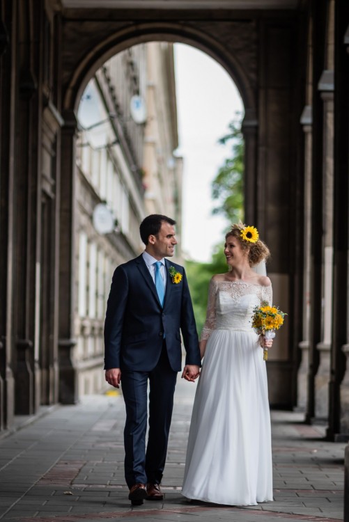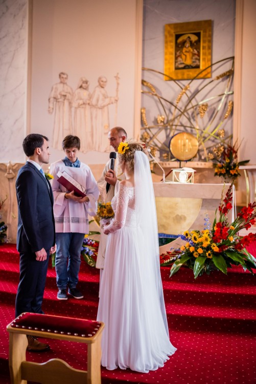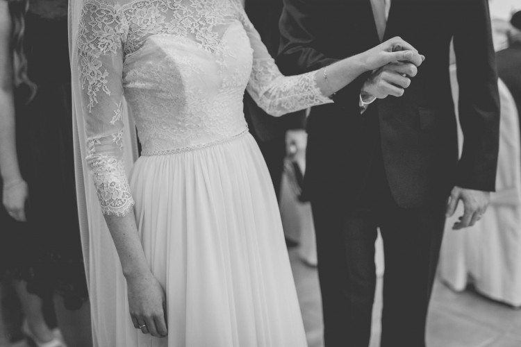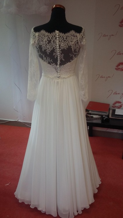Suknia jest wiązana z tyłu ale posiada również dodatkowe zapięcie na haftki.