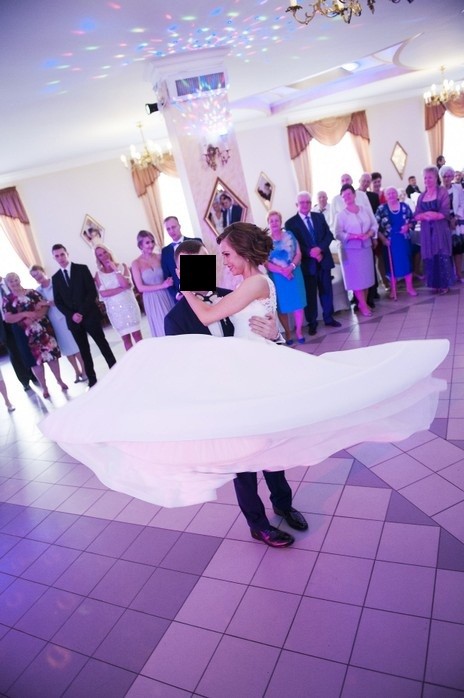 Suknia obłędnie wygląda w trakcie tańca, do tego jest lekka i bardzo wygodna. Noszenie halki z kołem nie jest koniecznie - również bez tego elementu suknia wygląda cudownie. Doskonałym, acz niewidocznym rozwiązaniem są kieszenie (schowane w fałdach spódnicy).