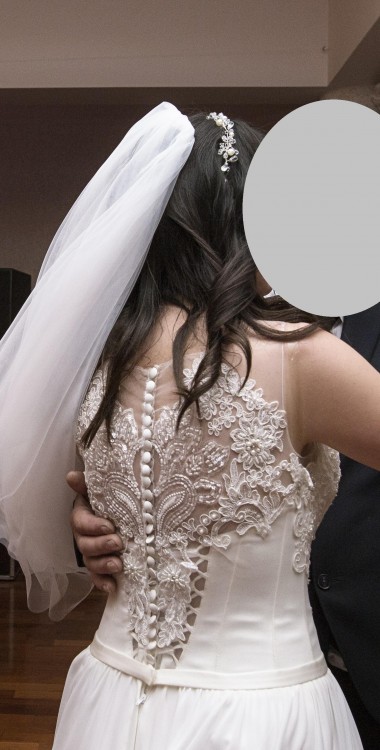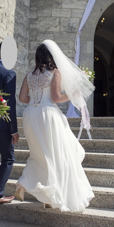 Sprzedam piękną i delikatną suknię ślubną Butterfly. Góra jest bogato zdobiona malutkimi perełkami i kryształkami, natomiast dół jest prosty, muślinowy. Talia dopasowana, dół luźny i swobodny, tył z guziczkami pięknie zdobiony w kształt motyla. Suknia idealna dla każdego rodzaju figury. Rozmiar biustu to 90