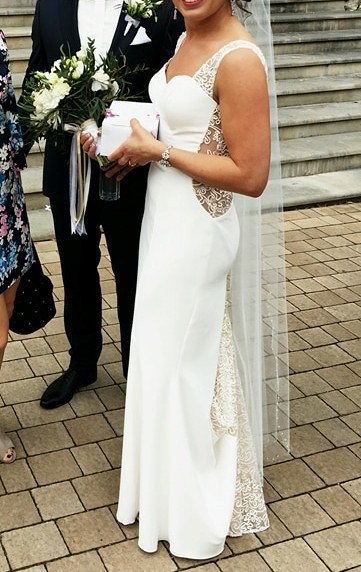 Sprzedam suknię ślubną projektantki Tina Valerdi - model Canela. Krój nietypowy prosty, ale zarazem gustowny i elegancki. Przepiękny tren i wstawki z oryginalnej hiszpańskiej koronki idealnie podkreśla figurę. Sukienka bardzo wygodna, w ogóle nie krępuje ruchów.