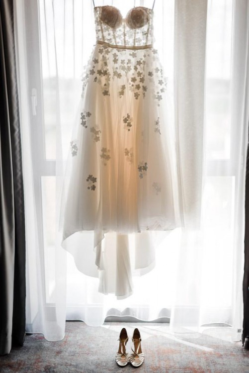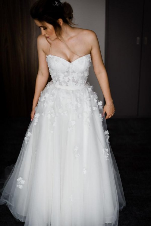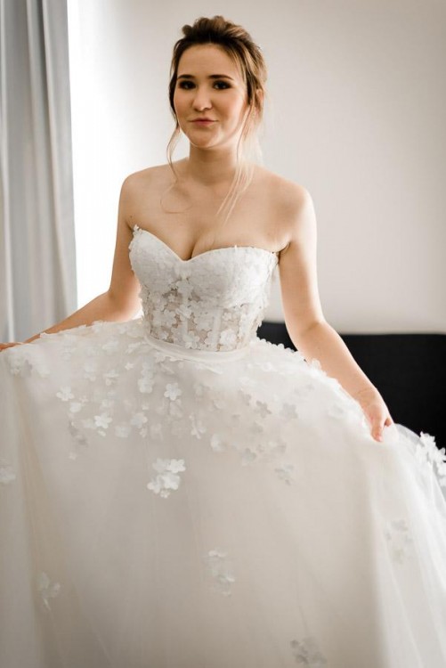 Suknia w kolorze Ivory z kwiatami "rozrzuconymi" po całej kreacji.