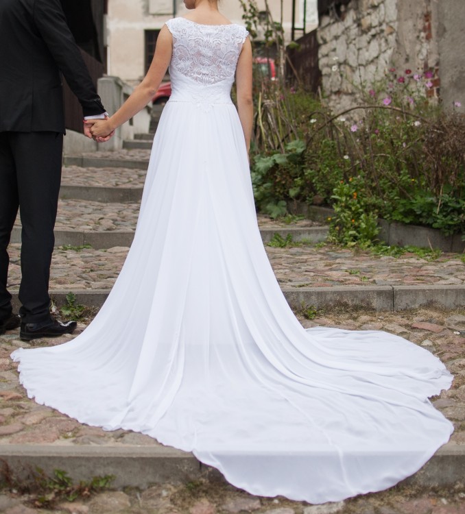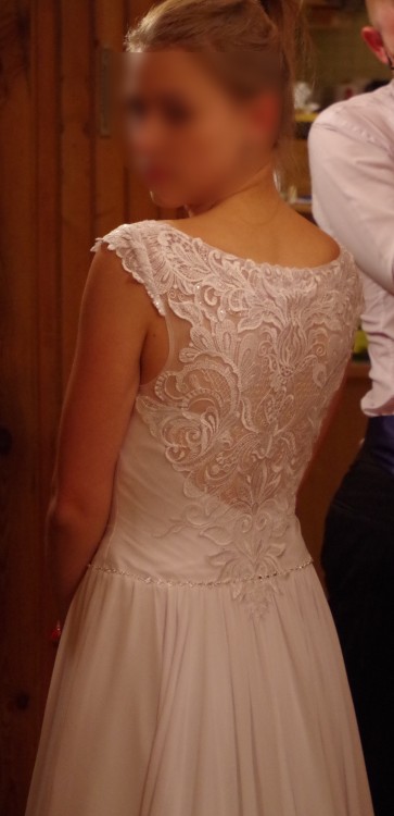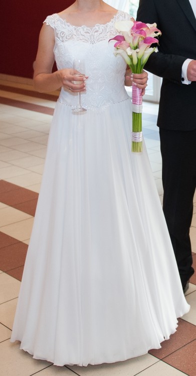 Sprzedam suknię ślubną Celia z salonu Celise, rozmiar 38, stanik B/C. W halkę ma wszyte małe koło, ładnie się układa. Zapinana z boku na suwak, jest wygodna, nie krępuje ruchów. Muślinowa spódnica nie gniecie się, nie zaciąga, z tyłu ma podczepiony tren, który ładnie układa się w fałdach sukni, nie odstaje. Koronka na górze ładnie przylega, jest miękka, delikatna. Suknia jest w bardzo dobrym stanie, nie zniszczona, po praniu. Polecam :)