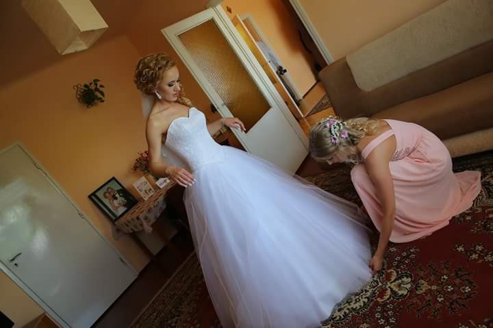 Suknia była szyta na miarę, rozmiar 36,wzrost 164 + 9 szpilka centymetrów. Do sukni dołączam podwójne kolo. Suknia jest w bardzo dobrym stanie. Świeżo odebrana z pralni. Polecam i zachęcam do zakupu. Pozdrawiam ☺
