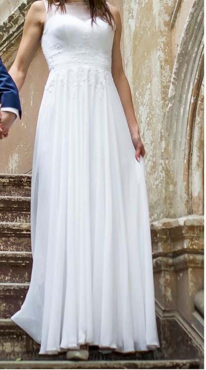 Rozmiar sukienki 36, wzrost 168, odpowiednia do obcasów ok.6 cm, kolor biały. Sukienka zwiewna i nieuszkodzona. Gorąco polecam i zachęcam do zakupu.