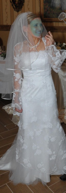 Sprzedam suknię ślubną Classa (polska firma). Suknia w rozmiarze 36, kolor biały ze srebrnymi motywami (detale widoczne na zdjęciach). Suknia typu rybka, z trenem, który można podpiąć. W zestawie narzutka, bolerko z takiej samej koronki.