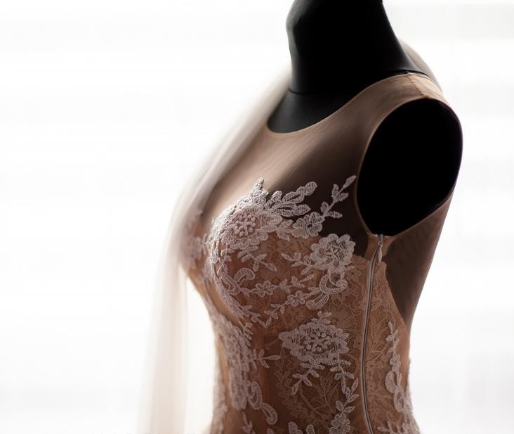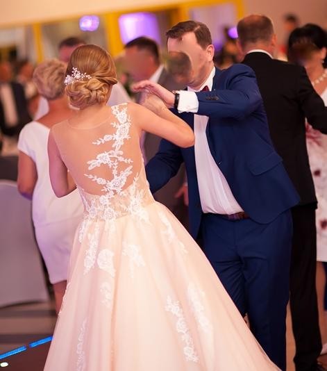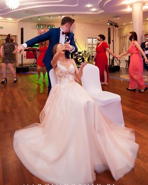 Suknia jest lekka i bardzo wygodna, złożona z kilku warstw tiulu, z pięknym koronkowym wykończeniem. Posiada tren, który można podwiązać - absolutnie nie przeszkadza w tańcu. Zapinana z boku na zamek błyskawiczny, który jest idealnie zamaskowany. Suknia pięknie się mieni, nie tylko w słońcu ale w świetle sztucznym również.