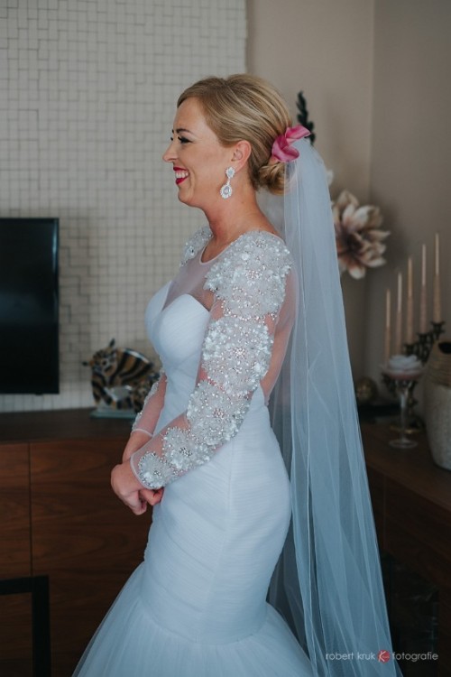 Cosmobella 7771 to model klasycznej dopasowanej rybki. Wykonana jest z delikatnego tiulu, który zaczyna tworzyć subtelną spódnicę od wysokości ud. Suknia posiada niewielki tren, który może być podpięty lub zupełnie skrócony.